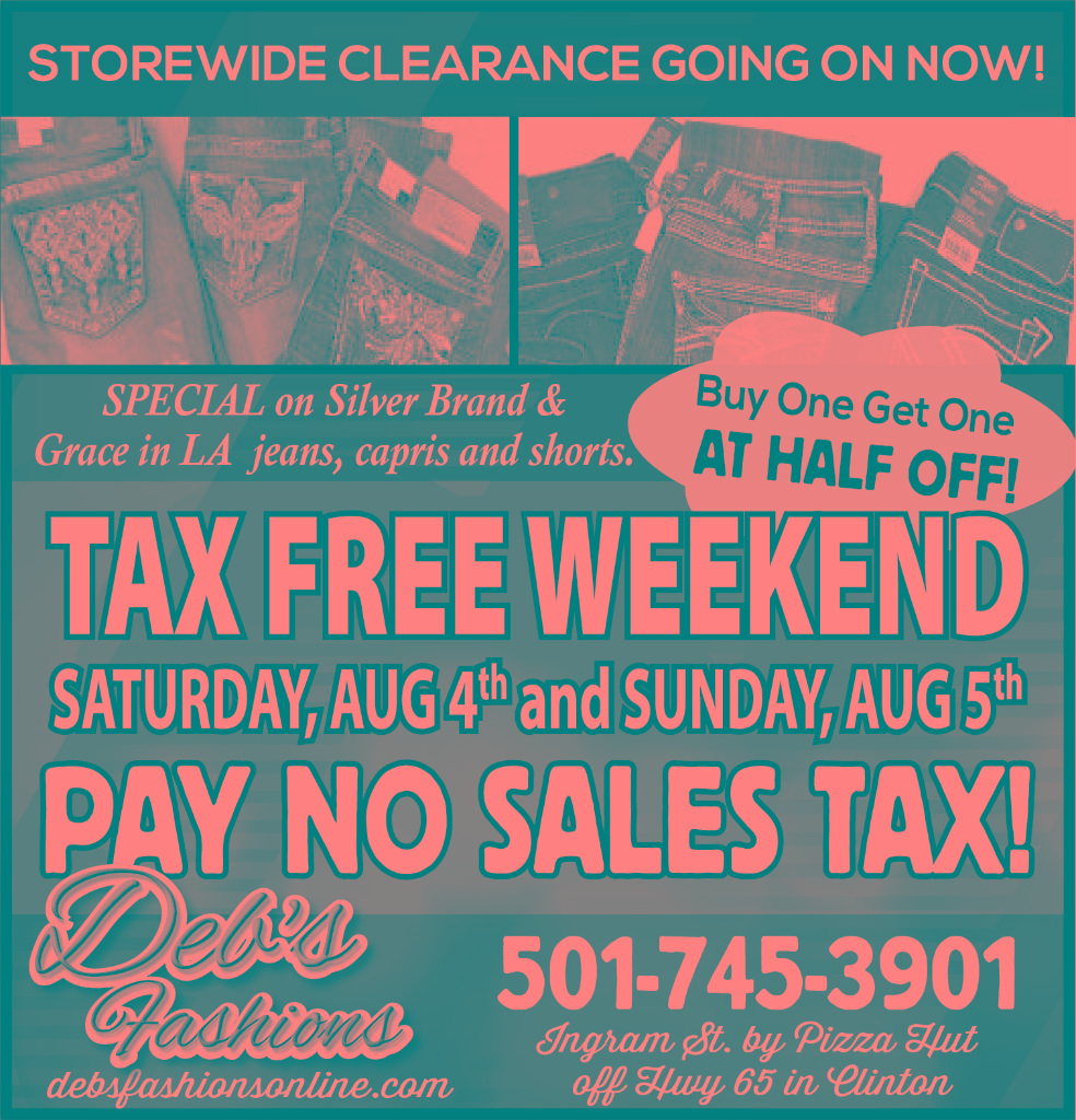 Tax Free Weekend Sat. and Sun. 10AM-4PM Lay-a-way 30 Days Tax Free! August 3, 2018 SAT. & SUN. 10AM-4PM TAX FREE! 30 DAY LAY-A-WAY TAX FREE! BOGO 50% OFF SILVER & GRACE DENIM! PLUS, MISSY,JR. AND MEN’S. Related