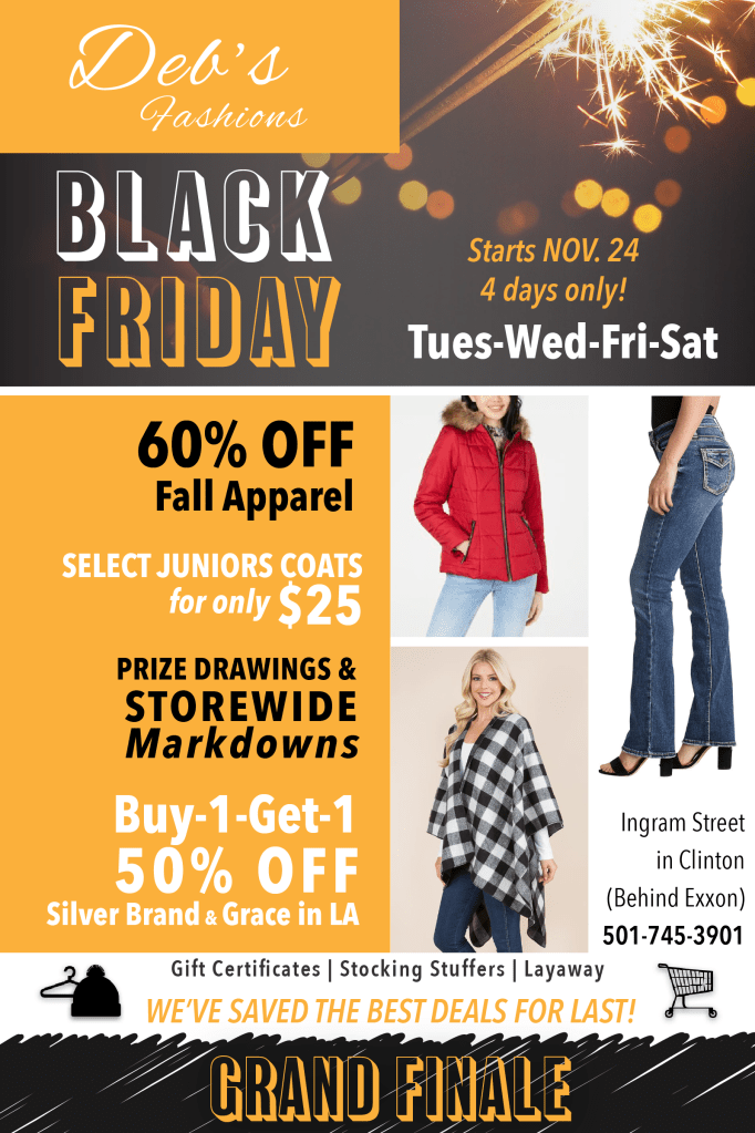 Black Friday Week!We Saved The Best For Last! Buy 1 Get 1 50% Off Silver Brand and Grace in La Denim! Select Jr. Coats $25.00 XS-2XAccessories 20% OffFaux Fur, Wraps, Assorted Zenana 20-40% OffStore Wide Markdowns Drawings For Gift Certificates!Lots of Great Christmas Gifts!