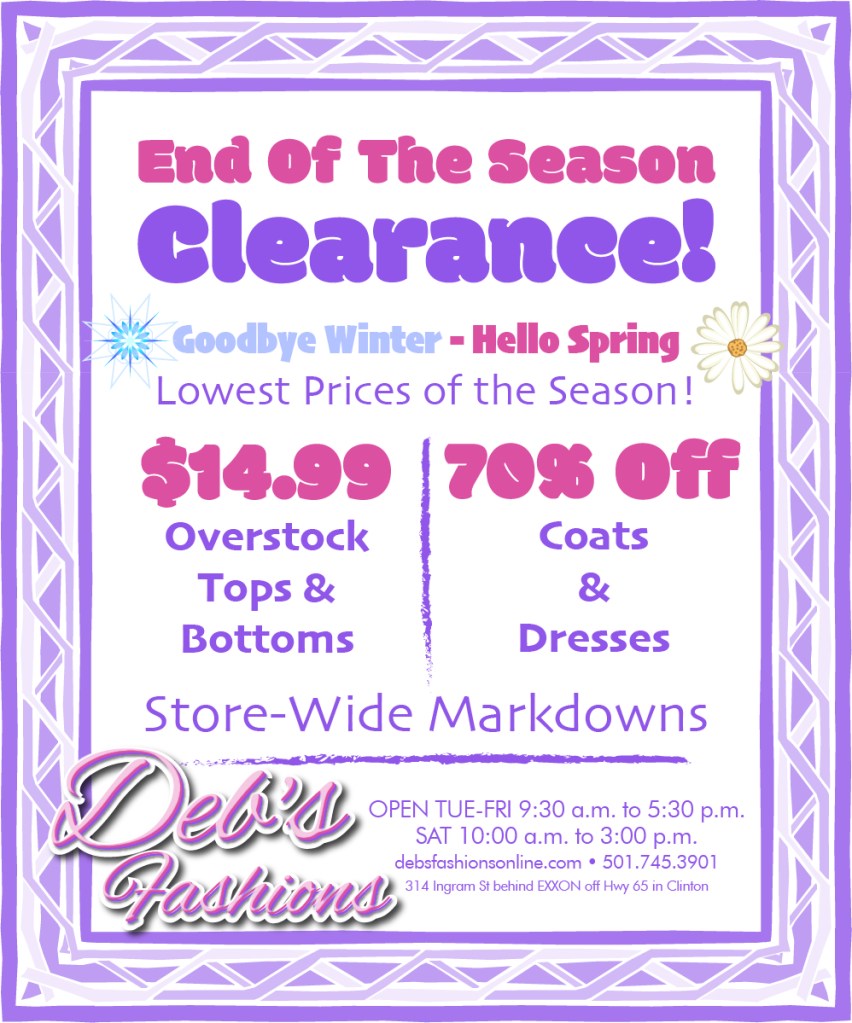 Don’t Miss Deb’s “End of The Season Clearance”! Lowest Prices of the Season! February 4, 2021February 3, 2021 Related