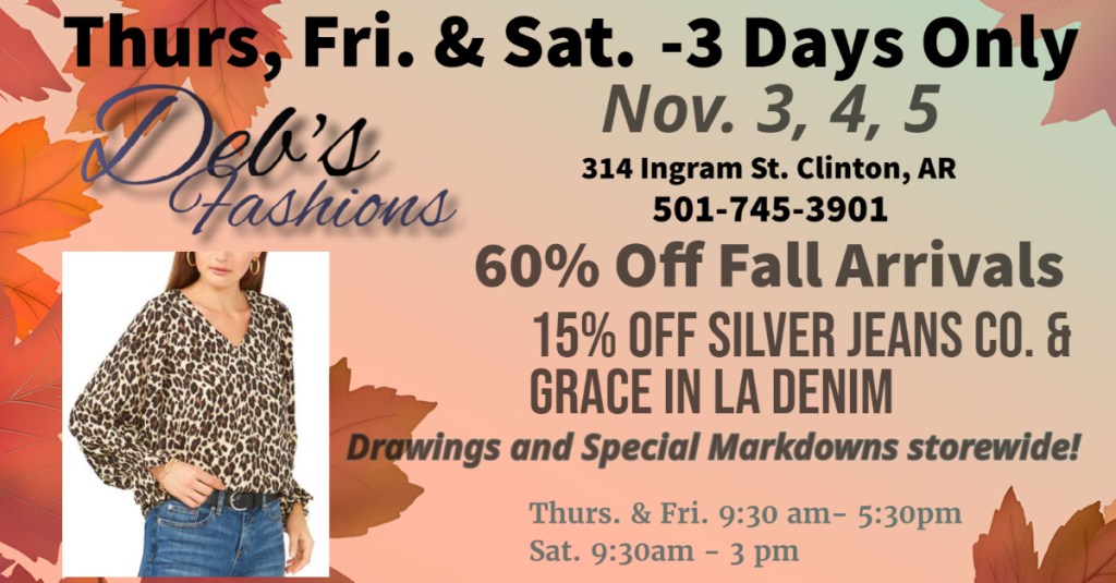 DRAWINGS FOR GIFT CERTICATES AND PRIZES! THIS THURS, FRI, AND SAT at DEB’S FASHIONS, 314 INGRAM STREET IN CLINTON,