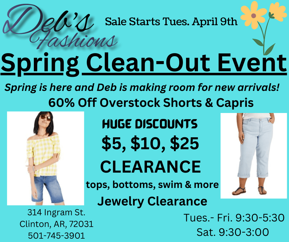 Spring Clean-Out Sale Continues!All Jewelry $10, Swimsuits $25, Comfort/Nurse Shoes $20 each or 2 for $30, $10 Zenana Tops. – $5, 10, $25 Tables & Racks. Cleaning out Inventory in front & back rooms of merchandise. Making Room For New Arrivals!