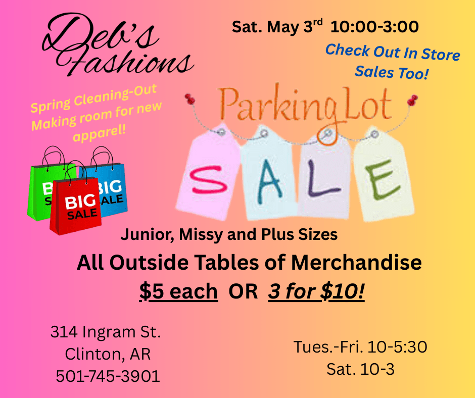 Sat. May 3rd 10-3. Spring Clean-Out / Parking Lot Clearance All Merchandise Outside is $5 each or 3 for $10! May 2, 2025 Related