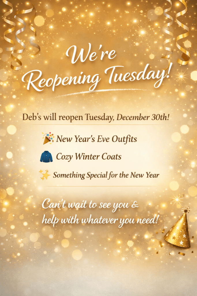 Deb’s will reopen Tuesday, December 30th, and we’ll be ready to help with: