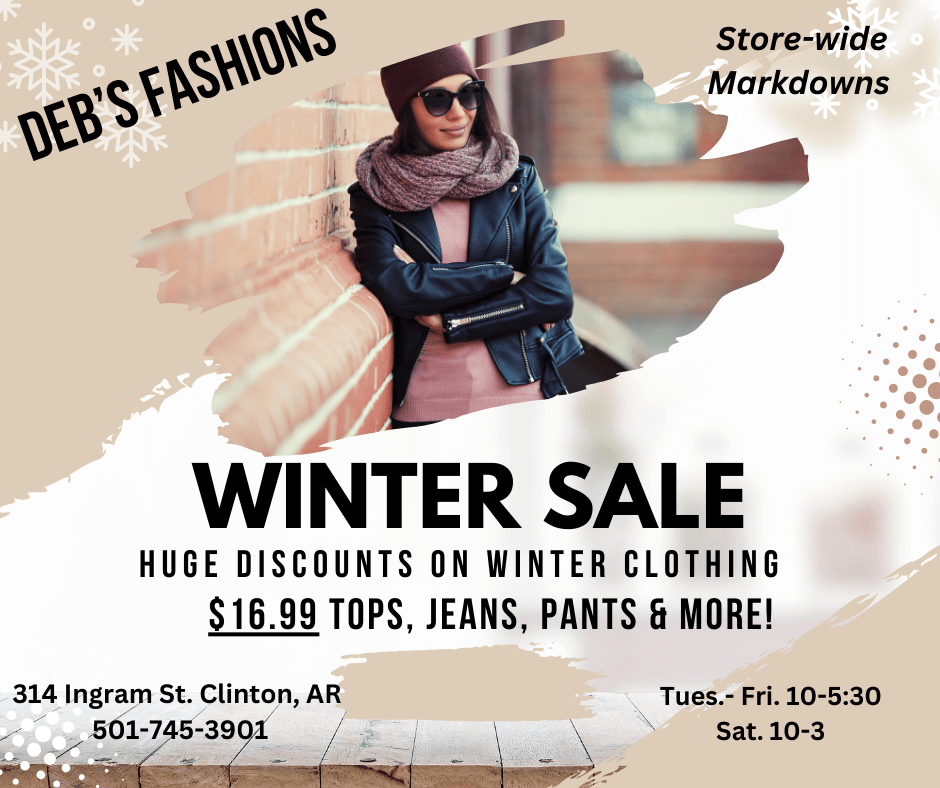 Deb’s Will Re-Open Thursday Jan. 29th at Noon. I’m excited to get back to work. I am starting My Annual Winter Clearance! Overstock Tops, Bottoms, Select Dresses an more are Now Just $16.99! Hurry in for best selection.
